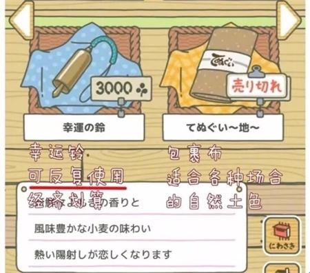 接下来说说道具,可以存钱买个幸运铃,也就是护身符~避免没有四叶草的尴尬。包裹布的话主要是装饰用。可以在拍回来的明信片里收到~