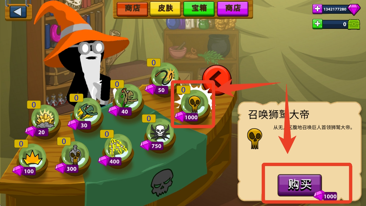 4、选择最右边的黄色骷髅图案,就是可以召唤狮鹫大帝的道具,需要花费1000钻石,点击购买。