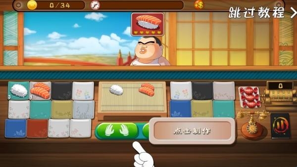 2、第一次玩,我们可以跟着教程学习如何玩这款游戏,我们经营这家寿司店,最重要的就是顾客,看他需要哪种食物,及时做出来给他。