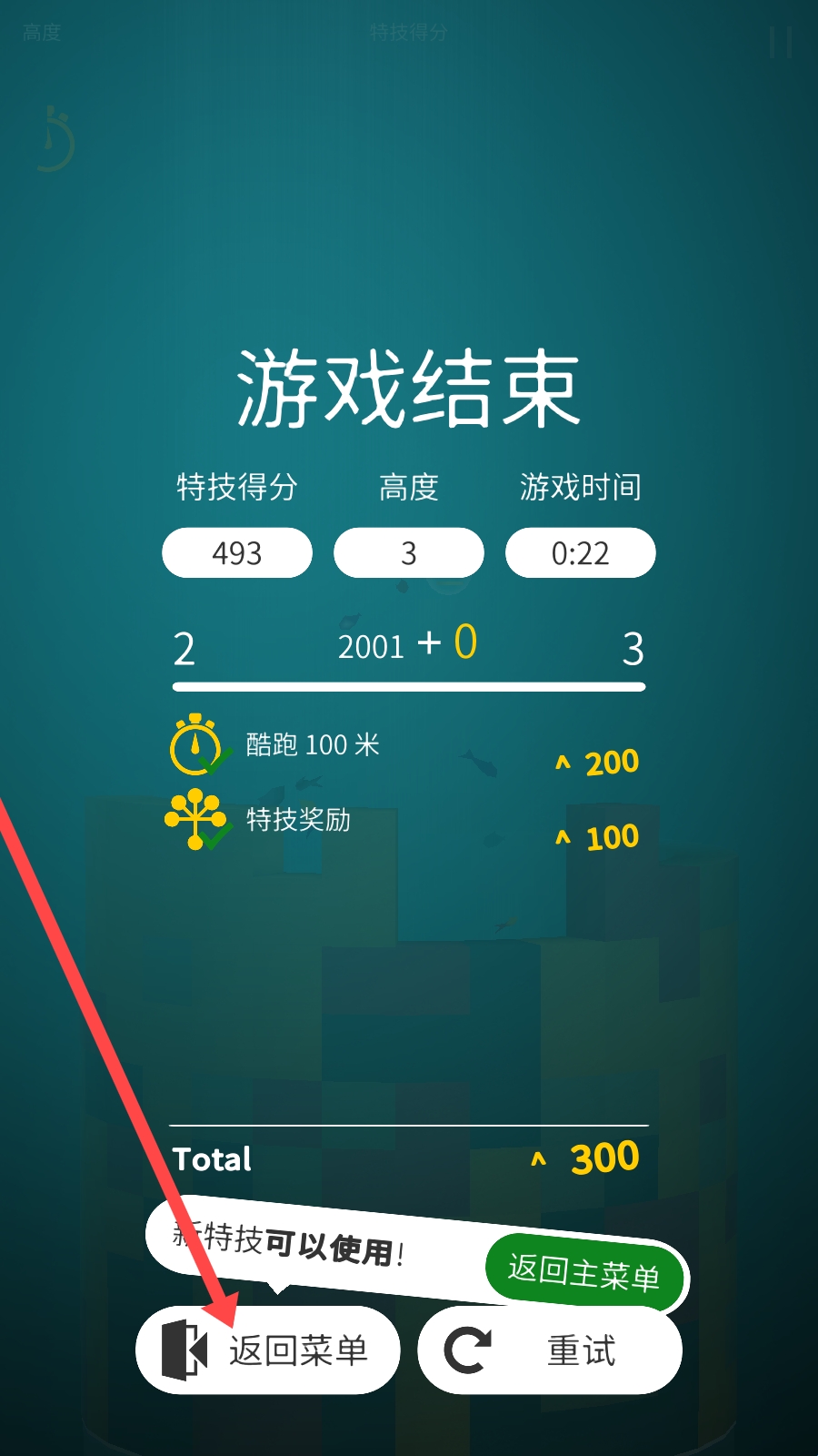 3、游戏结束后,若想结束当前游戏进程,点击【返回菜单】按钮回到主菜单;若想重新挑战当前关卡,点击【重试】按钮。