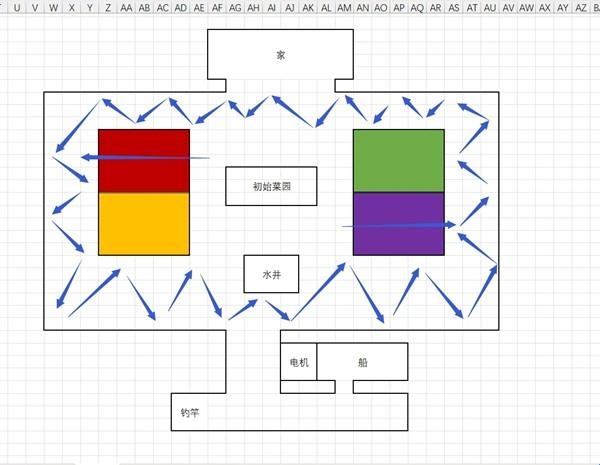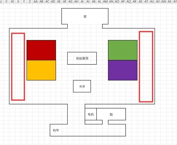 农场布局:只需解锁红色和紫色菜园,以开路和牵制鹿哥,放弃中间菜园,让鹿哥守护。