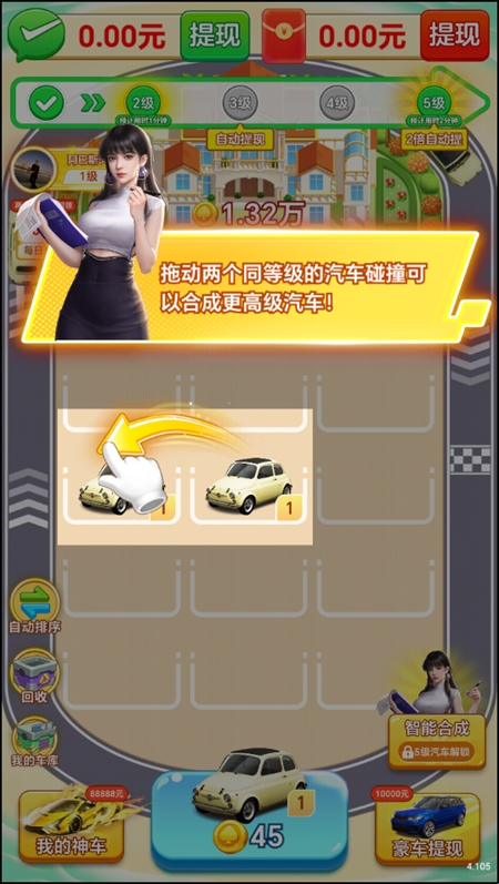 3、拖动两个同等级的汽车碰撞便可以合成更高级的汽车。