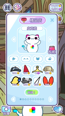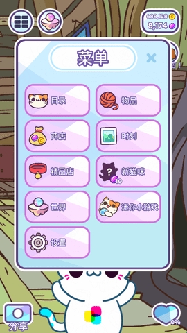 2、所有的功能都在菜单里面,猫咪、物品、商店、时刻、迷你小游戏等等。