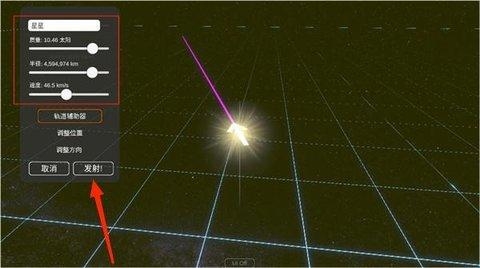 4、位置方向确定好后,然后可以调整球体的大小、自转速度以及质量等,参数设置完毕后点击发射即可。