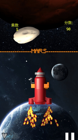 2、左右快速移动躲避太空中的陨石,同时也要收集金币,这些金币可以用来建造火箭、维修火箭、升级火箭。