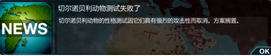 如果之前未退化动物性传播,则会弹出消息“切尔诺贝利的动物感染了(PAX12)”此时进化出任意动物的2级传播,弹出“切尔诺贝利动物测试失败了”并解锁成就“试下这个!”