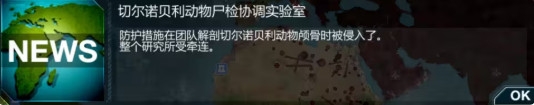 如果之前未点出任意动物的二级传播则出现消息“切尔诺贝利动物测试成功”此时点出“空气传播3”则弹出消息“切尔诺贝利动物尸检实验室”并解锁成就“深呼吸”
