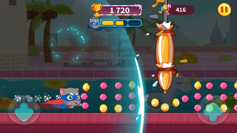 8、在闯关过程中还能收集道具,使用道具能让小猫冲刺加速。