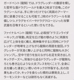 在Guard Vent(龙骑)中,最多召唤2枚以Dragreder的腹部为形状的坚固盾牌。这个Drag Shield不仅可以拿在手上,还可以戴在双肩的护甲上,当装备了2枚Drag Shield时,还可以召唤Drag Saber和Drag Claw等攻击武器。
