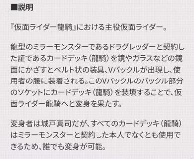 与龙型的镜怪物Dragreder签订契约的卡片套匣(龙骑)放在镜子和玻璃等的镜面上时,腰带状的装具V Buckle出现并戴在使用者的腰上。通过在这个V Buckle的插槽上装上卡片套匣(龙骑),假面骑士龙骑完成变身。