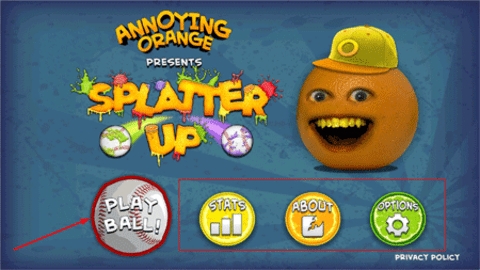 1、打开烦人的橘子游戏,进入主页可以看到功能按钮,黄色按钮可以选择表情、橙色是关于游戏介绍,绿色可以设置游戏声音,点击PLAYBALL开始游戏。