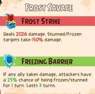 严寒障碍(Freezing Barrier):如果任何盟友受到伤害,攻击者有20%几率被击晕/冰冻1回合,持续3回合。