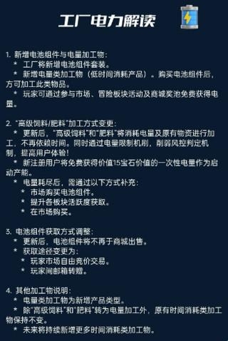 据官方相关人员所说,原有的“高级饲料”和“肥料”将需要消耗电量加工,有机会立即加工完毕。意思是只要有足够电量和原材料,每天可加工的“高级饲料”和“肥料”数量不受时间限制。
