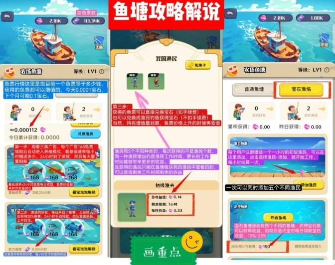 那么,很多小伙伴会问一个问题,增值的部分哪里来呢?我们前面提到,每个玩家6条广告创造的广告价值平均在5宝石,玩家每次观看广告拿走其中的0.6宝石,剩下4.4宝石等于放入了沉淀池,由平台分配。假如平台有10万用户,能产生50万每天广告收益,玩家拿走6万,其它44万划分到了鱼票池,其实,这个时候鱼票的实际价值是5宝石÷6000鱼票等于0.0008每张,只是其中0.0007平台暂未做价值分配,因为平台为了用户推广,做了个拉新奖励机制以及上涨机制,用户数到一万,平台就放入其中16%拉升鱼票价值上涨一倍,以及抽取部分做上级推广奖励机制。简单点理解就是,你带来的5收益,先给0.6,用户到一万的时候再给0.6。但是每个用户上涨的倍率是不同的,因为很多用户可能之前通过各种抽奖,工厂,渔民兑换,消耗掉了,所以,平台把所有用户的第二笔0.6添加进去的时候,就会有没换走的少部分用户分走多部分的利益,所以理论上官方添加0.6会造成3-5倍的上涨。其二,游戏官方设置了兑换宝石手续费,等级不同,收的手续费最高50%-5%,这些扣走的手续费也是都是添加到鱼票池给未兑换的用户进行鱼票增值。鱼票池总鱼票为1,宝石为1的时候,你拿走0.5,只能得到0.25,另外的用户必然就是1鱼票等于0.75,所以,提升鱼塘等级降低手续费也是很有必要的课程。其三就是消耗游戏对于鱼票的消耗,所有玩家消耗的鱼票都销毁,这样剩余的持有鱼票用户划分总宝石。