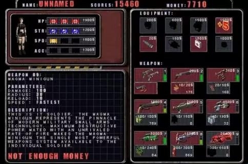 1、与1.0版相比,1.2版除了修正一些BUG外,还降低了枪的价格,这对于游戏苦手来说无疑是个福音。威力最强劲的九号枪原本要五万元,现在降为二万五,便宜了一半,基本上第七关打完后你就可以买到了,当然前提是你必须把所有的隐藏点找到。