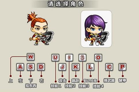 玩家一:AD控制移动,J攻击,K跳跃,S拾取道具,C换武器,1~4使用技能,P暂停查看技能表。