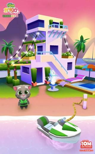 2、会说话的汤姆猫作为职业选手,通过自己的打拼,早早地拥有了属于自己的满级摩托艇以及豪华别墅。