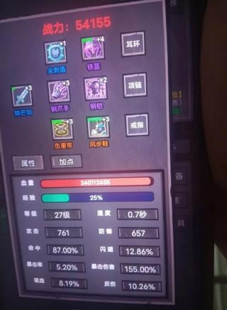 2、主角有装备和加点可养成,装备是替换式升级,单件装备有品级设定,总计一把武器和9个装备槽位,战力提升有绿色箭头标记,很好辨别。主角每升一级获得5个点数,创角的时候还有15点,可自由分配在力、体、身三个属性上,有推荐加点功能,基本不用动脑子。