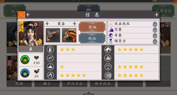 1、本游戏最强骑将,大清国蓝格格,突袭奇袭骑兵将领必备,领导力无脑走位突进收割,攻击战术偶尔暴击比较爽。