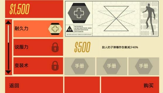 13、另外就是属性栏,可以增加黑人大哥的各项能力,需要过关来解锁,单是第一项减少子弹爆炸伤害40%就已经很厉害了...后面一定要多多攒钱加属性啊。