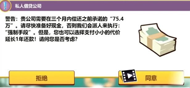 西装男上门的时候如果手里资金不够就点同意延长时间,如果够偿还了就点拒绝,等着系统自动扣钱