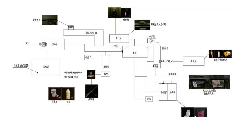 个人习惯路线(非固定游戏路线),出电梯拿完【手电】,中路直走前往停尸房解密完拿上道具【锤子】,出停尸房左转去“电视房”区域里的“大小房间”搜索有没有磁带,然后一路直走去“投影房”开“暗房”拿【螺丝刀】,然后去“花瓶房”砸花瓶获得【红门钥匙】,前往“红门房”,“画廊房”解密完获得【保险丝】(第二关进去需要装保险丝)。前往“停尸房”放置人物对应部位,打开去“更衣房”的道路,解密完获得【防化服】【辐射仪】等物品,即可前往辐射房。