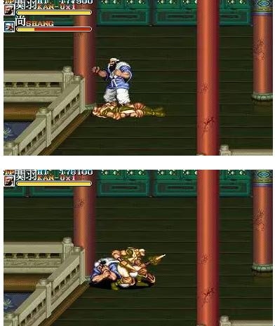 这种情况下,如果是用赵云和黄忠↓,↑+A打起身,敌人可能直接就退出了玩家的攻击范围然后反击。如果是关羽的↓,↑+A一般都会打中一两下(因为横向攻击范围大),但敌人有可能还会继续后退走出下落攻击的范围然后反击,如下图的情况。